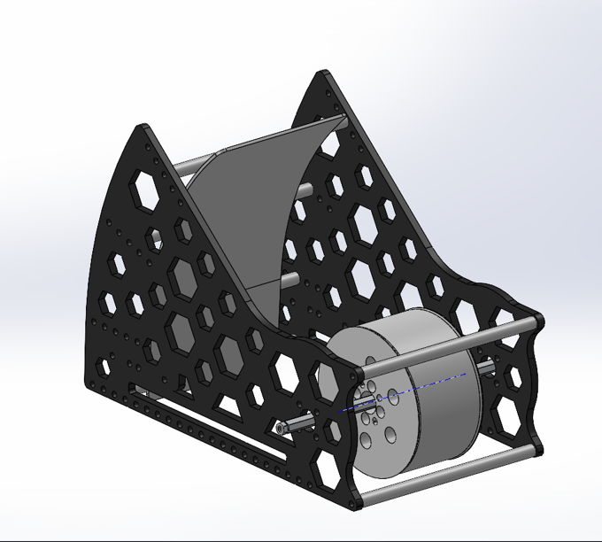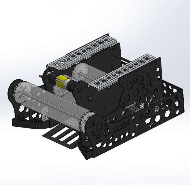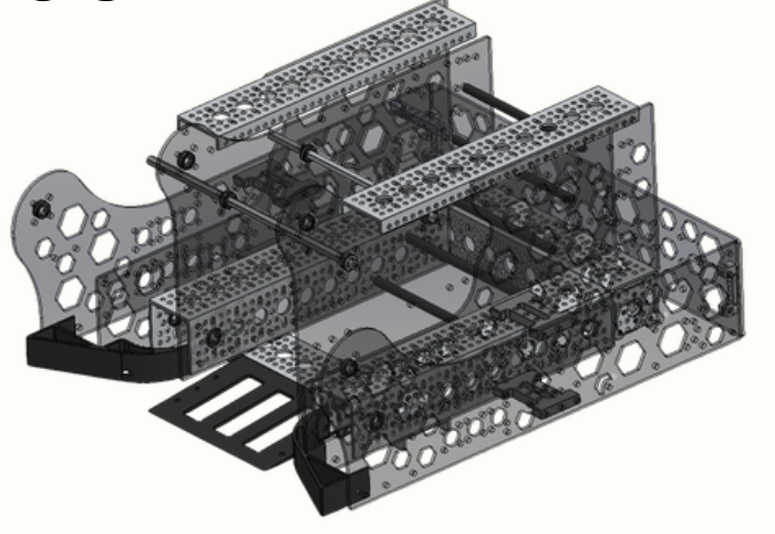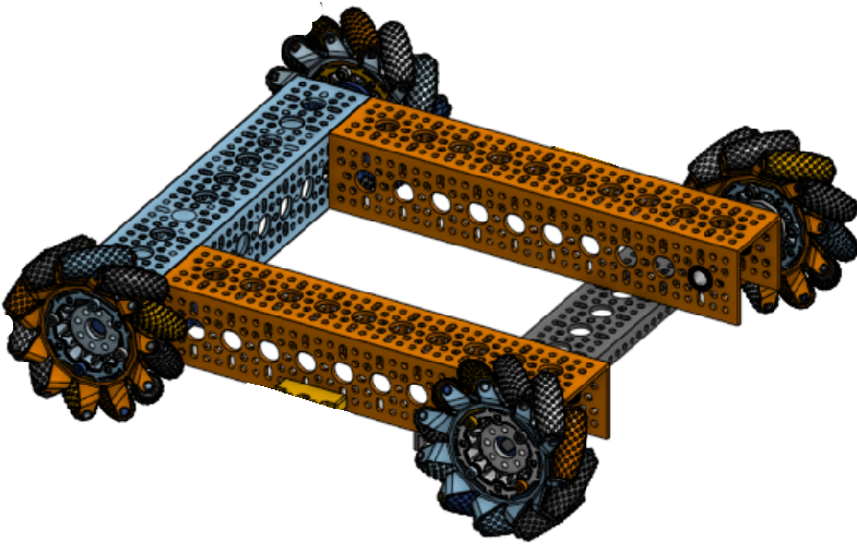 800g wheel, fixed 45°. 2 GoBilda 6000 RPM motors. Triple wheel system.
